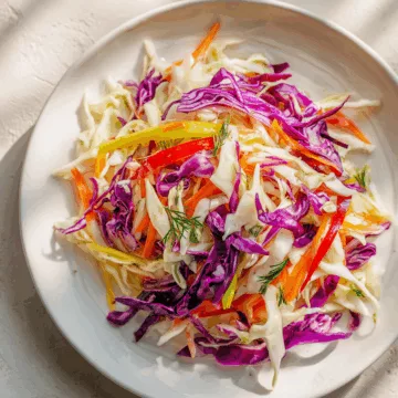 When you scoop the slaw onto a serving platter make little peaks for drama. Sprinkle a few extra shreds of purple cabbage on top for a bright finish. I sometimes lay a few thin apple slices on the edge of the bowl to hint at hidden sweetness.