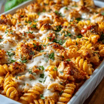 I scoop the pasta bake into big shallow bowls so you see the layer of cheese and crisp chicken first. Then I sprinkle a little fresh parsley or basil on top. It brightens the look and adds a fresh herb note.